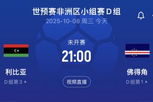 体育资讯10月08日讯 今晚21:00,世预赛非洲区小组赛,佛得角将客战利比亚,距离历史首进世界杯仅一步之遥!