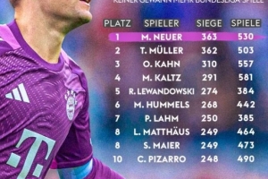 体育资讯10月19日讯 德甲第7轮比赛,拜仁在安联球场以2-1的比分力克多特笑傲国家德比。本场比赛,拜仁门将诺伊尔迎来自己第530场德甲比赛,而他也取得了第363场胜利,这让他超越穆勒成为德甲胜场数最多球员。